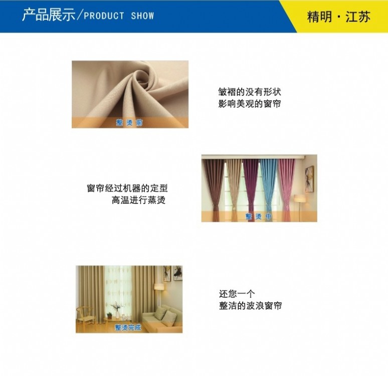 ●此機器適用于窗簾真空定型,皺的沒(méi)有形狀影響美觀(guān)的窗簾經(jīng)過(guò)高溫整燙之后耳目一新的自然波浪窗簾即可形成
